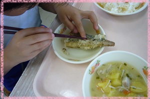 10月の給食でも骨付きの魚が出ます。