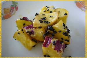 今日は乱切りにしたさつまいもを油で揚げて大学いもに調理しました。