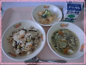 〇 もずくのスープ 今日は中華料理でおなじみの「エビマヨ」でした。