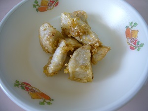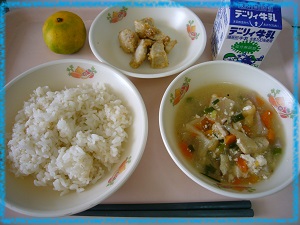 〇 みかん 里芋のおいしい季節になりました。今日は県内産の里芋を角切りにして,軽くでんぷんをまぶし,油で揚げて,手作りの田楽(でんがく)みそをからめました。