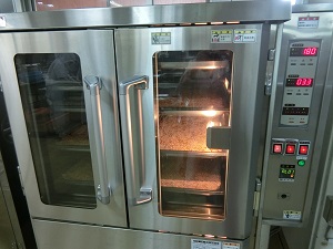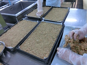 出来上がった生地を,オーブンの鉄板に敷き詰め,上からごまをふりかけて180℃で20分ほど焼きます。
