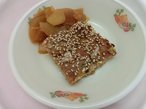 おいしく焼き上がりました。横に添えてあるのは,屋久島の青パパイヤで作った漬け物です。調理場で手作りしました。