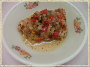 このソースを,油で揚げたシイラにかけて完成です。