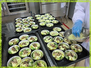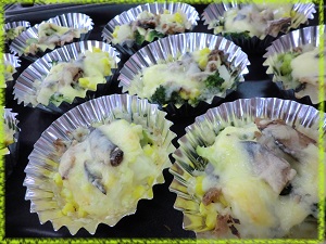野菜と一緒にアルミカップに入れ,とろけるチーズをのせてオーブンで焼きます。