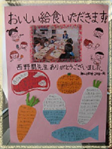 先週一緒に食についての学習をした神山小学校の1年生と2年生から,授業で使用した「きゅうしょくカード」とお礼のお手紙が届きました。