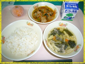今日は,プルコギをごはんにかけていただきます。コチュジャンのピリ辛味で食がすすんだようです。