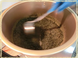 お茶の葉(煎茶)を乾煎りしている様子です。調理場中にお茶のいい香りが漂いました。