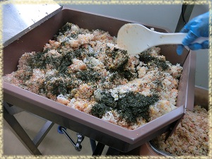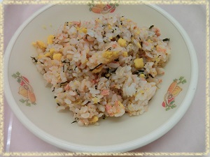 炊きあがったごはんに,お茶・鮭そぼろ・卵そぼろを混ぜ込みます。